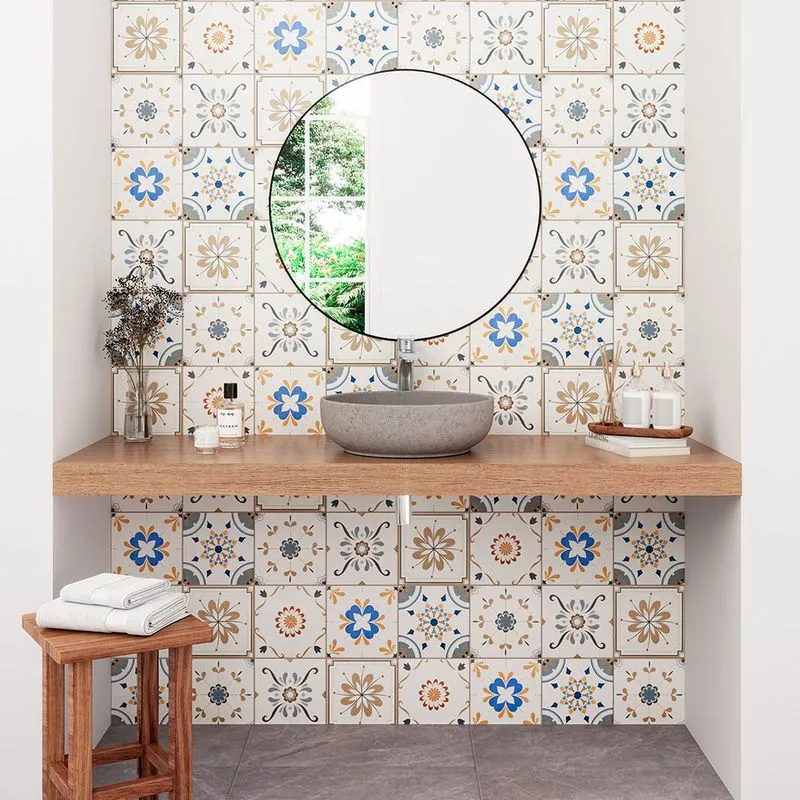A. Descripción: Cerámica Varanasi Multicolor son piezas delgadas para revestir pisos y paredes, fabricadas con un soporte arcilloso esmaltado que proporciona impermeabilidad y resistencia al desgaste. Están disponibles en acabado Mate y son aptas para áreas de tráfico residencial moderado.